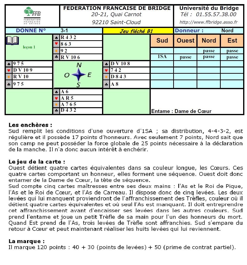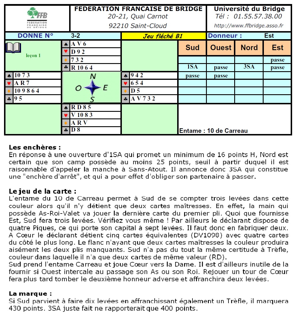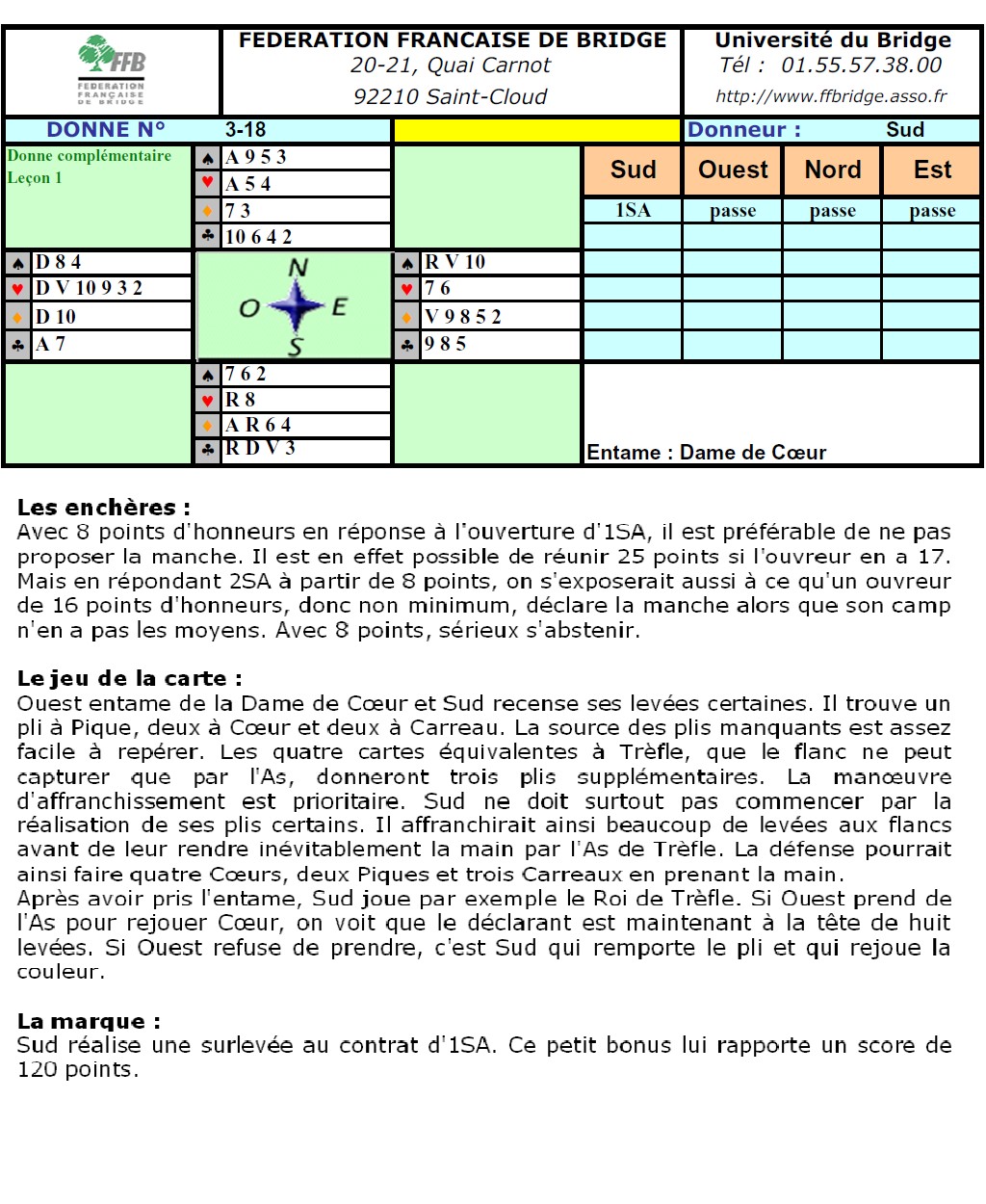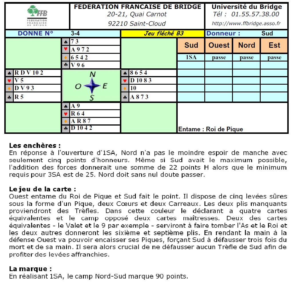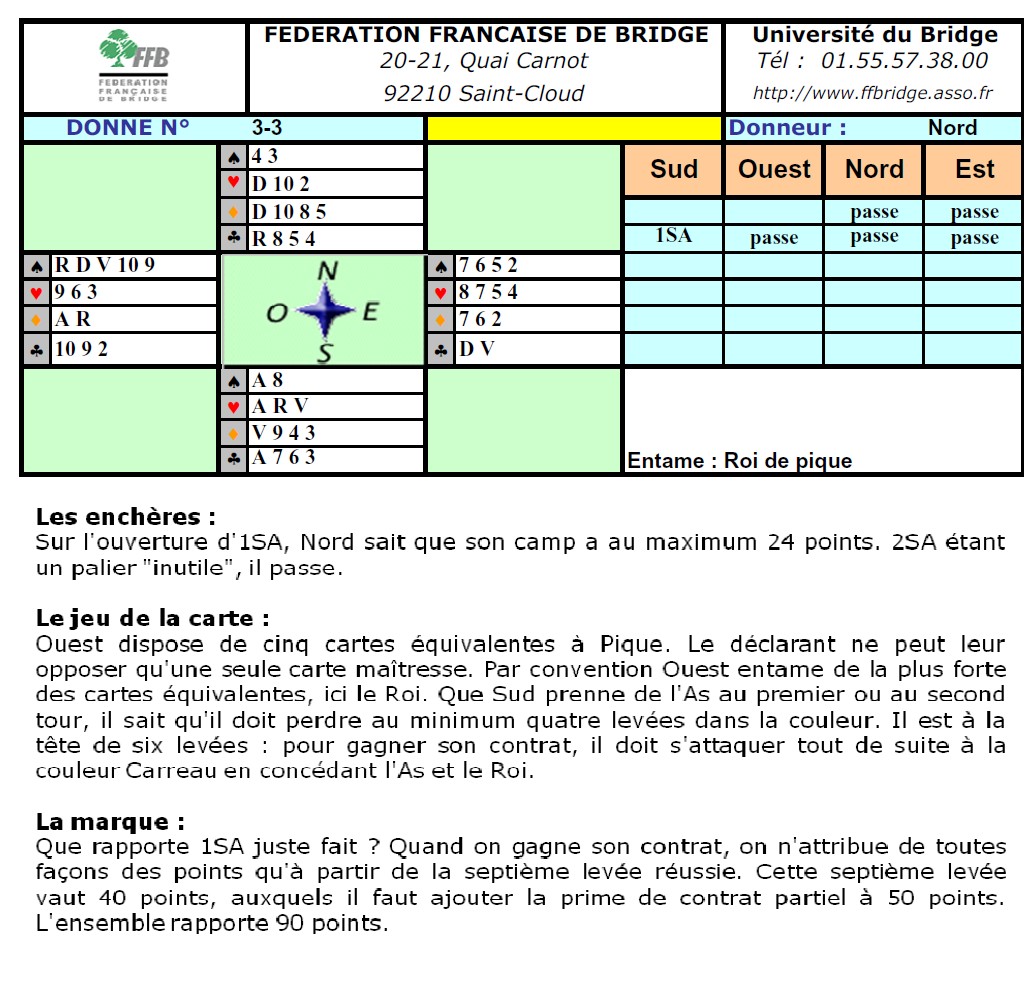 Le déclarant, qui a toujours les mêmes cartes que précédemment, demande cette fois 3SA. Il réalise toujours dix levées, et obtient :