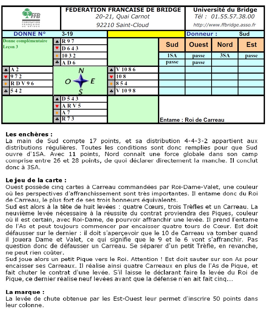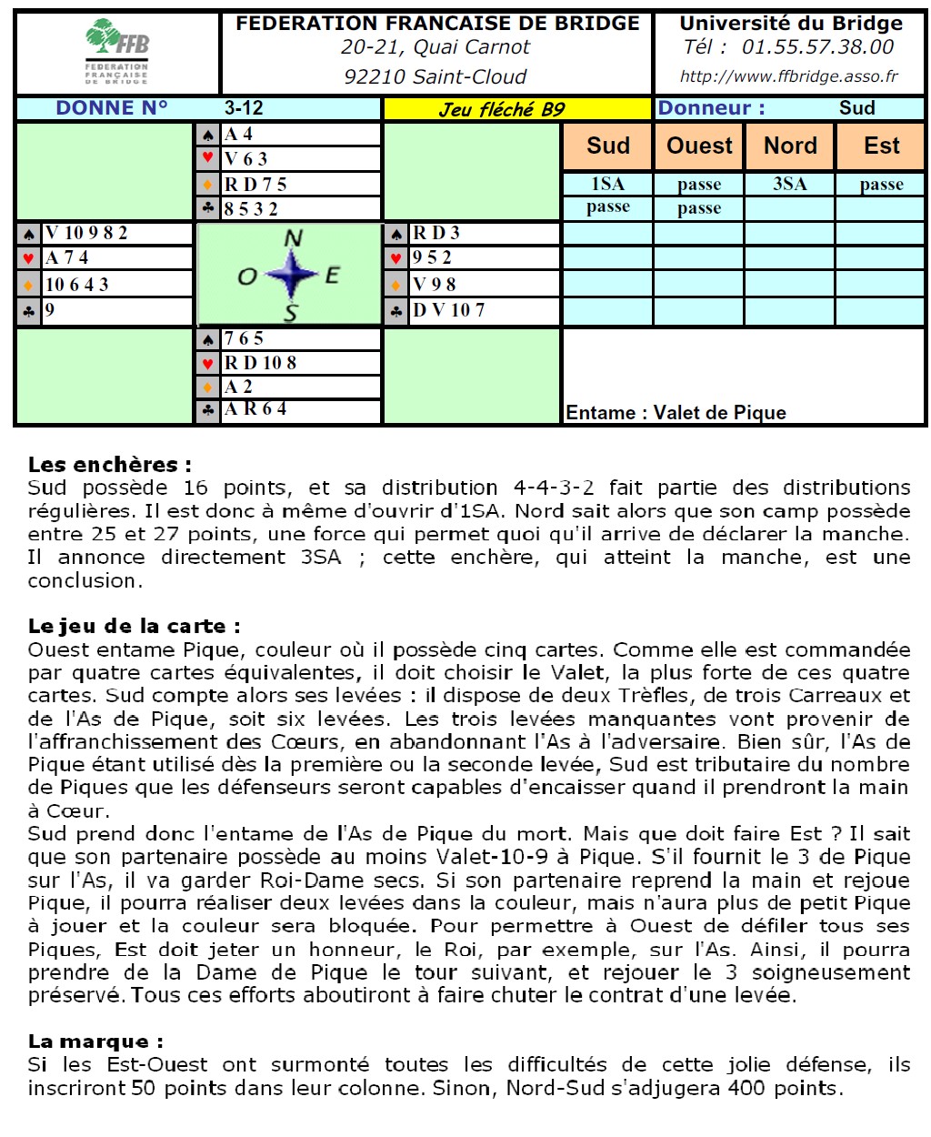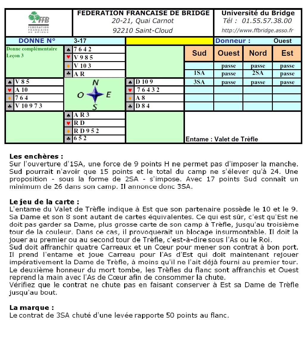 2) Proposer la manche grâce à l'enchère de 2SA avec exactement 9 points. C'est alors l'ouvreur qui va décider : il passera avec 15 points. Il déclarera 3SA avec 16 ou 17 points.