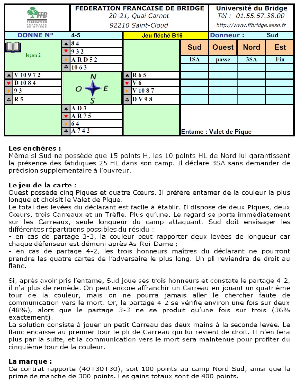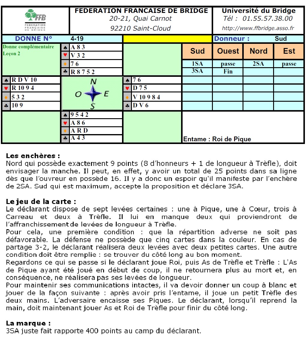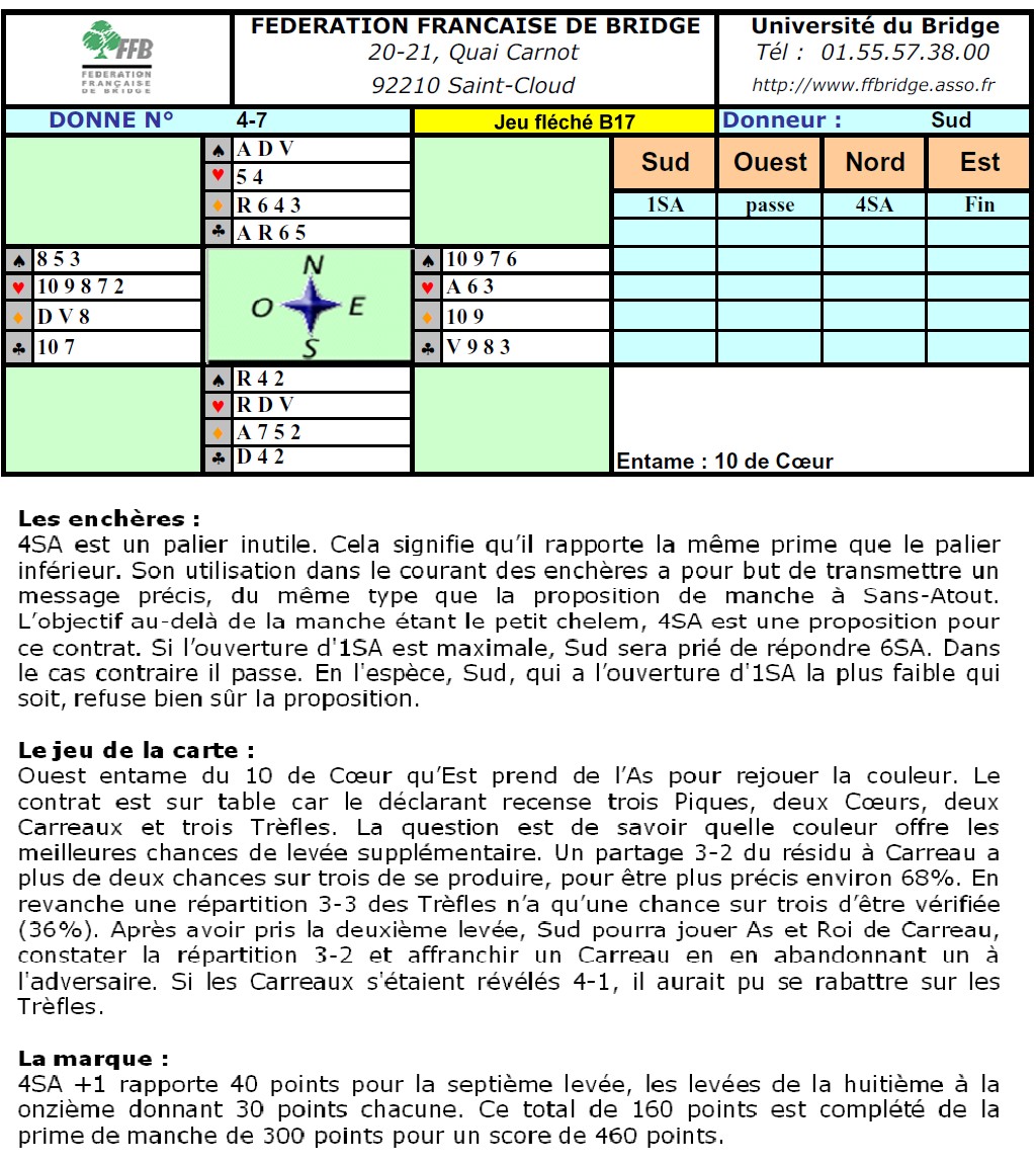 répartition 4-4-3-2, à la condition expresse que ce soit le partenaire qui détienne quatre cartes. Ceci se produira en