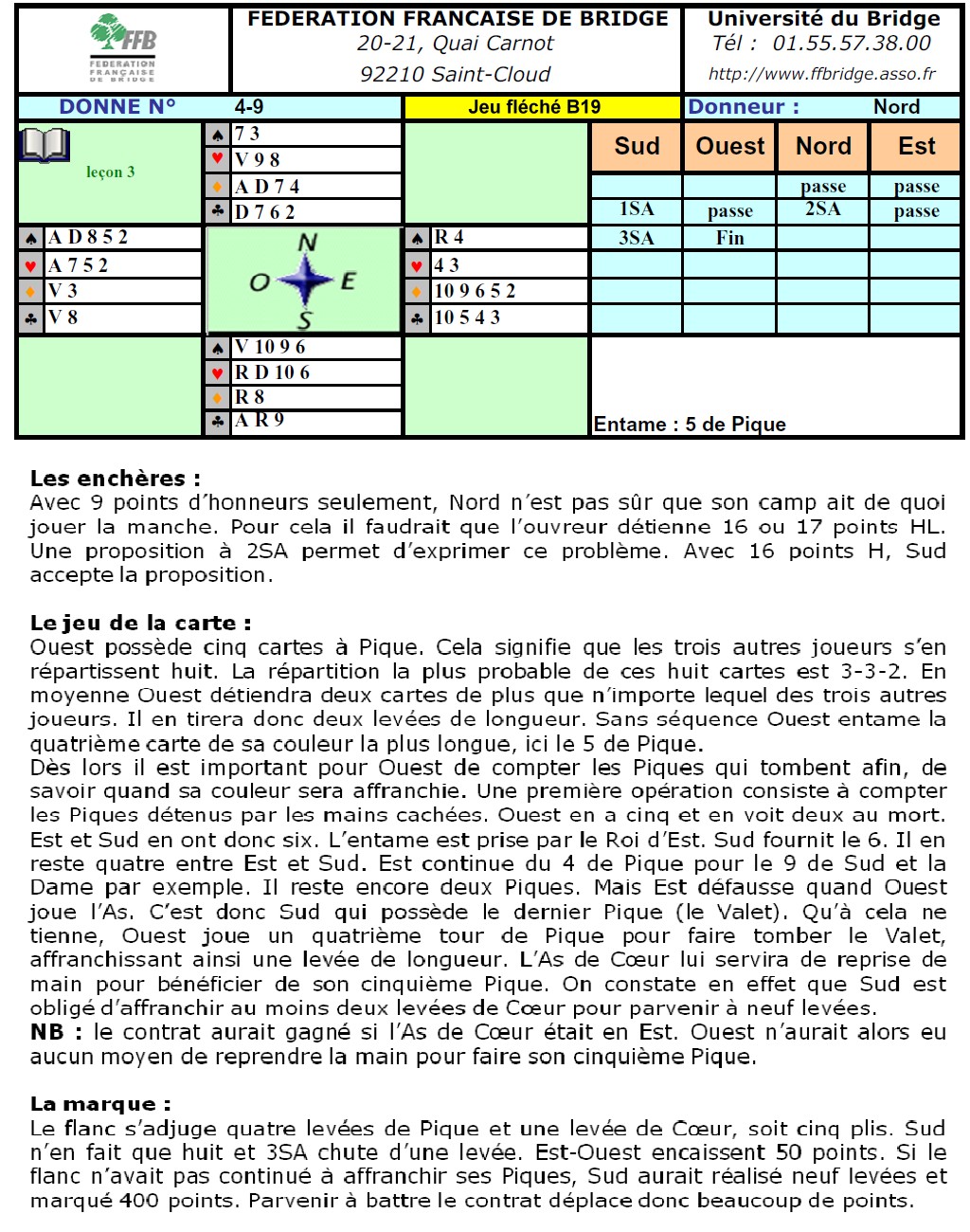 Est-Ouest ont encaissé cinq levées, mais, s'il en avait eu le temps, le camp Nord-Sud avait de quoi gagner son contrat et en réaliser neuf : une à Pique, quatre à Carreau, une à Cœur (qui sont toutes certaines) et trois à Trèfle facilement affranchis sables .