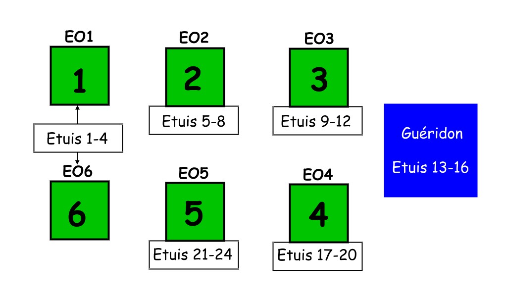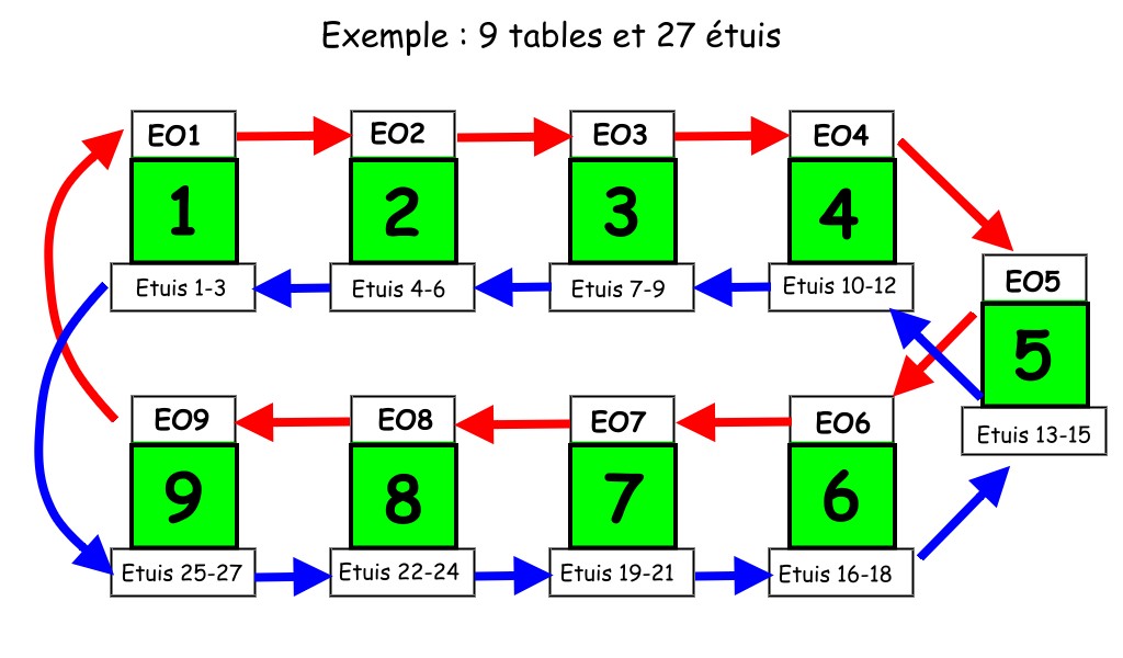 Règle 1 :  L’arbitre prépare un nombre d’étuis multiple du nombre de tables.